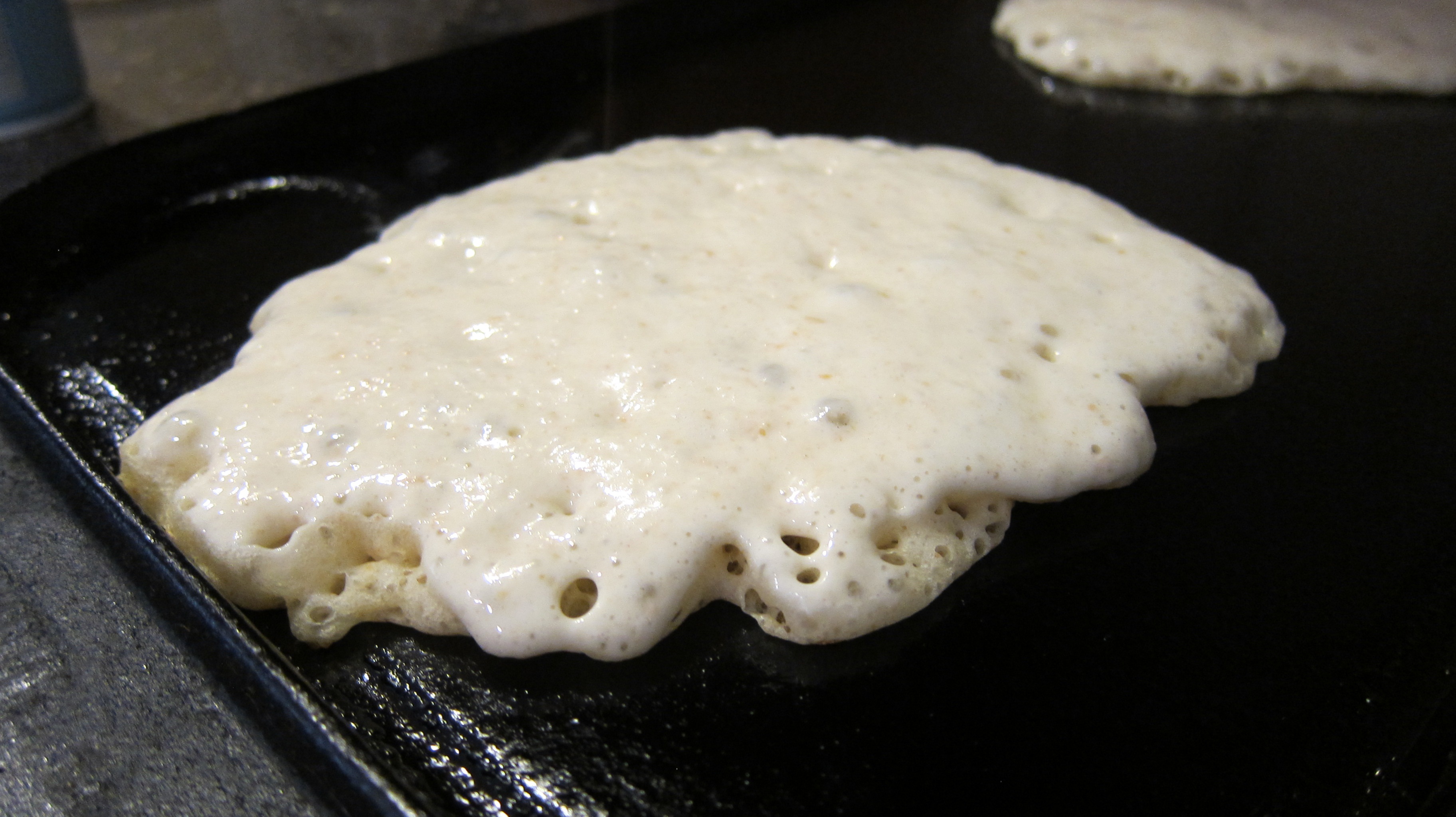 Pour your sourdough batter onto the hot grill. Wait till the top bubbles before turning.