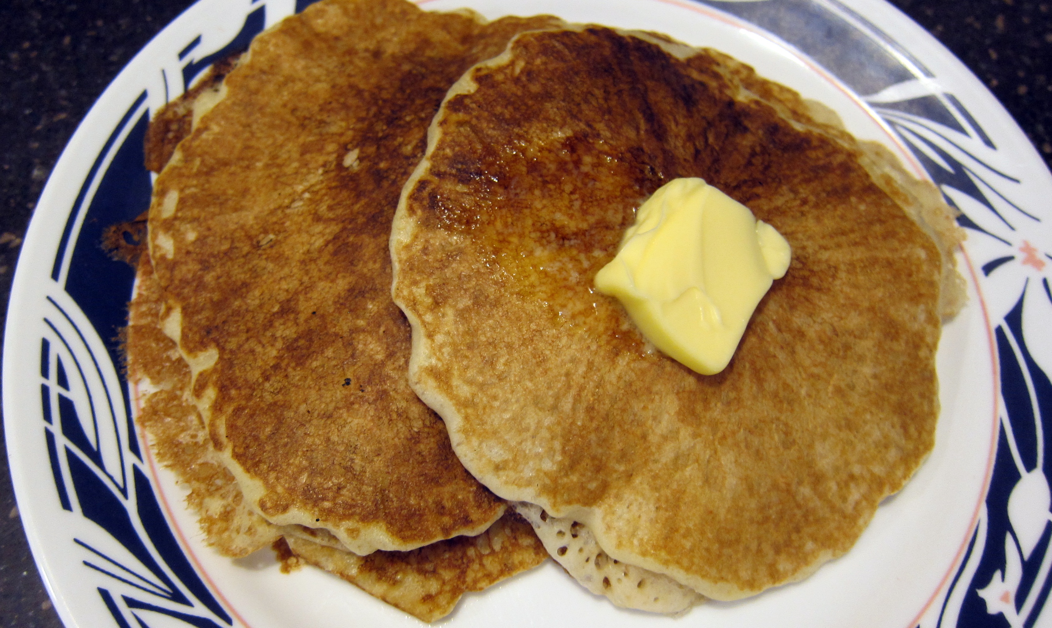 Sourdough pancakes don’t taste like any other pancake. Not buttermilk or buckwheat, they have a flavor all their own. Whenever I have a high carb breakfast, like a bowl of oatmeal or pancakes or waffles, I’m usually hungry three hours later. It’s like a flash in the pan. The carbs burn up quickly and I’m left starving before lunch. Not with Sourdough Pancakes. Sourdough pancakes have nothing in common with other pancakes, except in shape and color. And the proof is in the pudding, or sourdough. After a breakfast of sourdough pancakes I’m good until lunch, late lunch. These hotcakes really stick to your ribs. It has to be the high protein content of sourdough. The fermentation of the wild yeast changes things in the flour. It breaks down the grain into amino acids and makes it tolerable even for the gluten intolerant. If you are interested in all the health benefits of sourdough you should read this article by Sasha Navazesh.