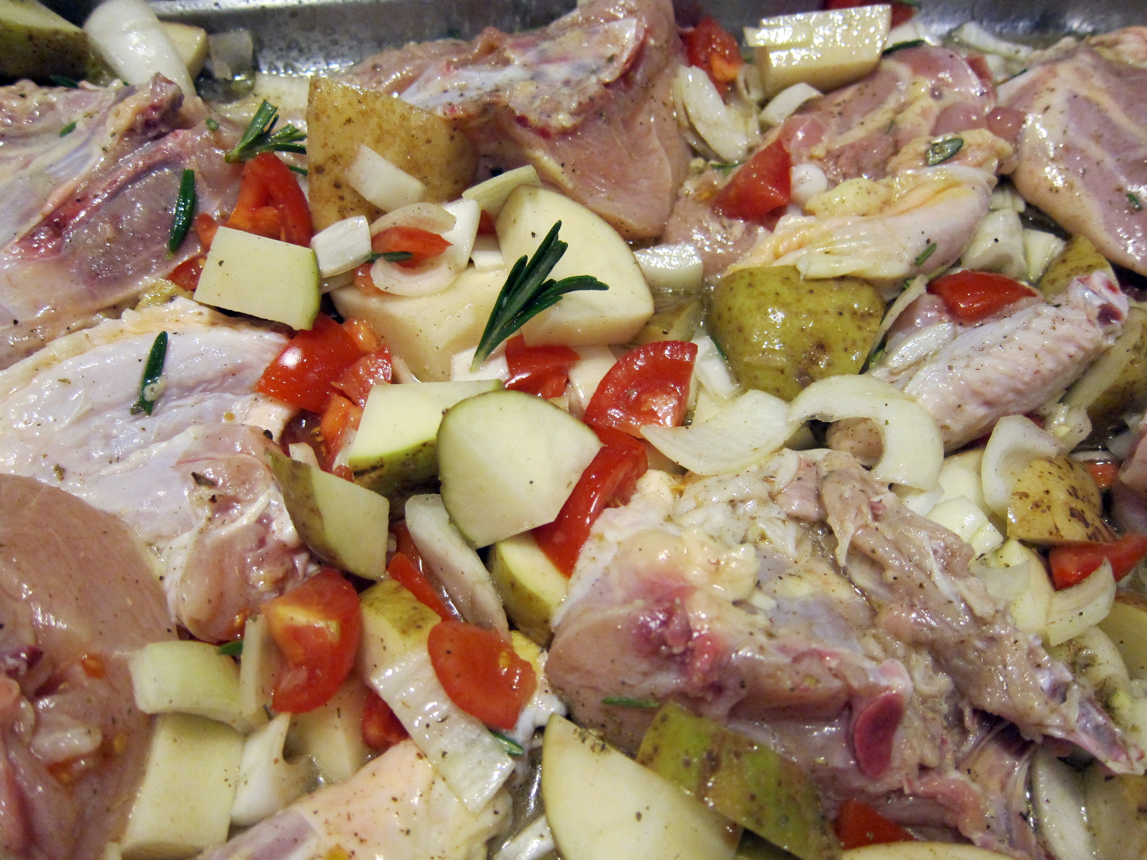 Drain the chicken, no need to rinse, just pat dry with paper towel.  Add to the pan and toss till everything is mixed well. Arrange the chicken, skin side down, between the vegetables in the pan. Roast for 35 minutes. Turn the chicken skin side up and stir up the vegetables. Cook for another 35-40 minutes, or until chicken and potatoes are golden brown.