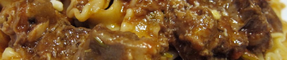 Add to the pot the carrots, onions, and celery and stir well. Add salt and pepper to taste. Leave untouched about 4-5 minutes till they start browning before you stir up. This browning adds to the flavor. Add the chopped garlic and stir, cooking for another 1-2 minutes. Deglaze the pot with the cup of red wine and cook down for 2 minutes. Add the tomatoes straight from the can, crushing each plum tomato by hand. Add all the juices from the can. Stir well. Add back the oxtail into the pot. Add enough water to the pot so everything is just covered. Stir well. Pull the rosemary from their stems and roughly chop and add to pot, along with the whole sprigs of thyme (you can fish out the stems at the end) and the bay leaves. Stir well and bring to a boil. Cover and place in the oven for three hours. Check halfway through to see if it needs more liquid to keep everything covered.