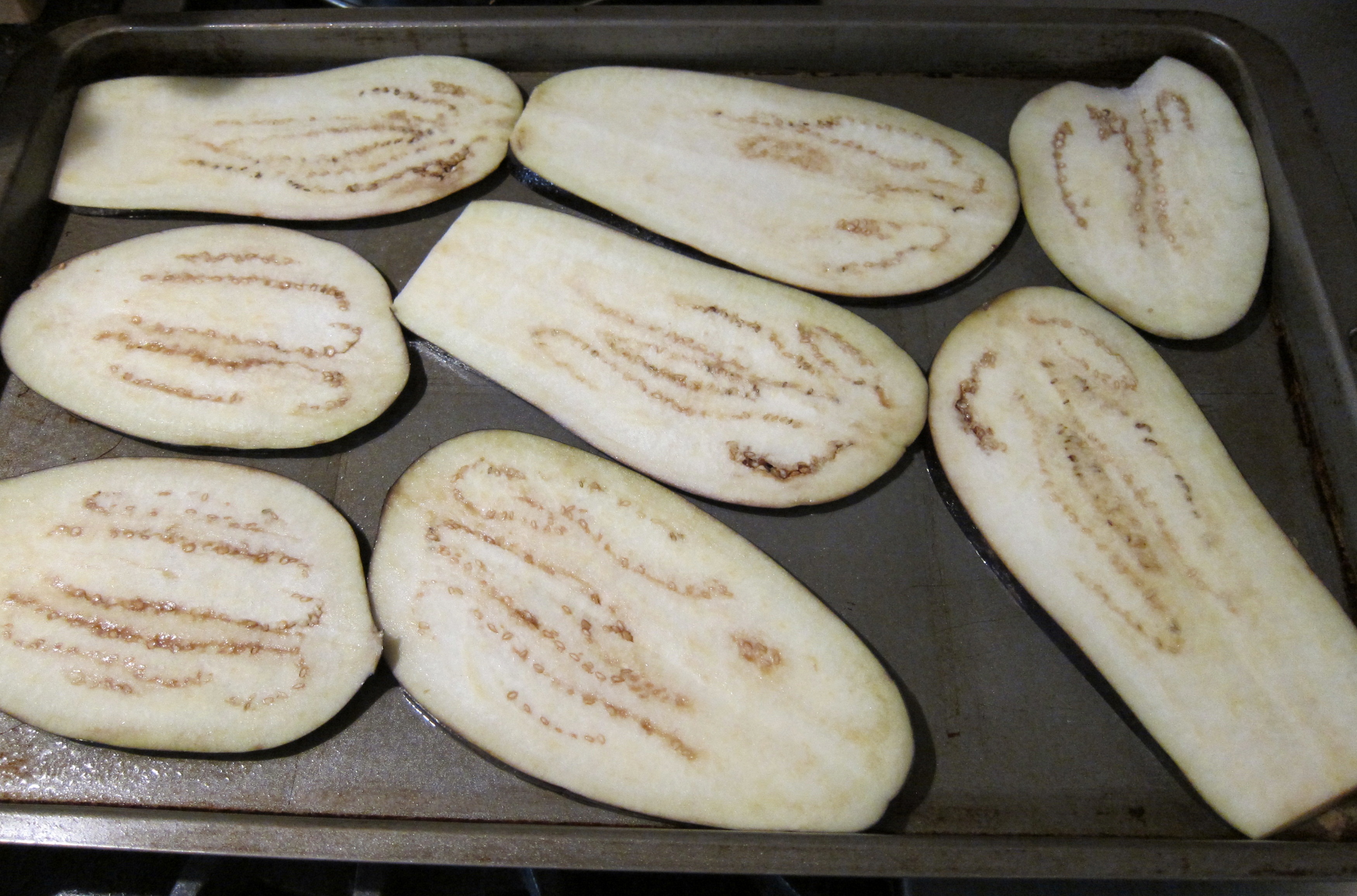• 2 medium eggplant, sliced lengthwise 1/4″ thick