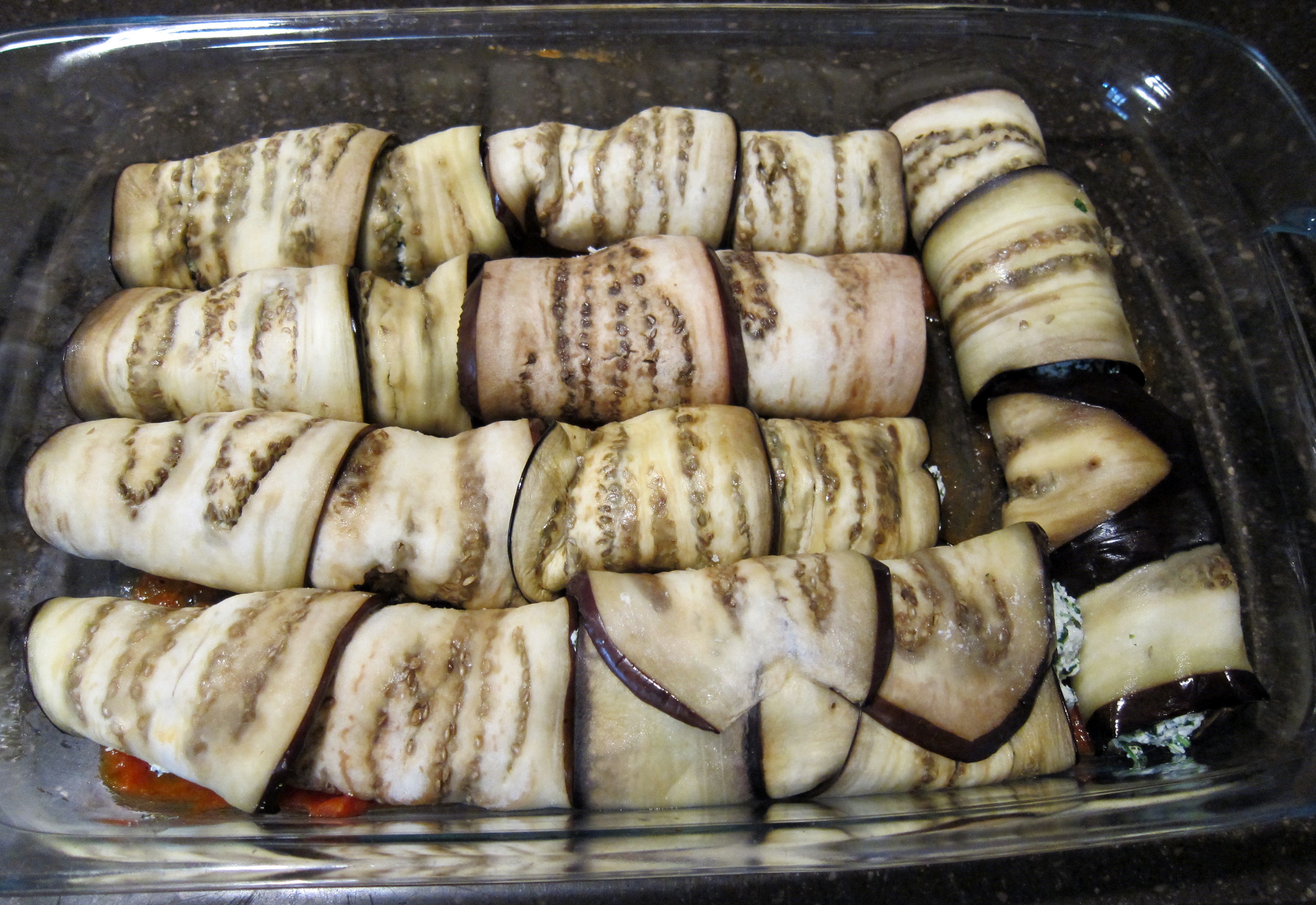 Carefully roll the eggplant around the ricotta filling and place seam side down in the prepared baking dish.