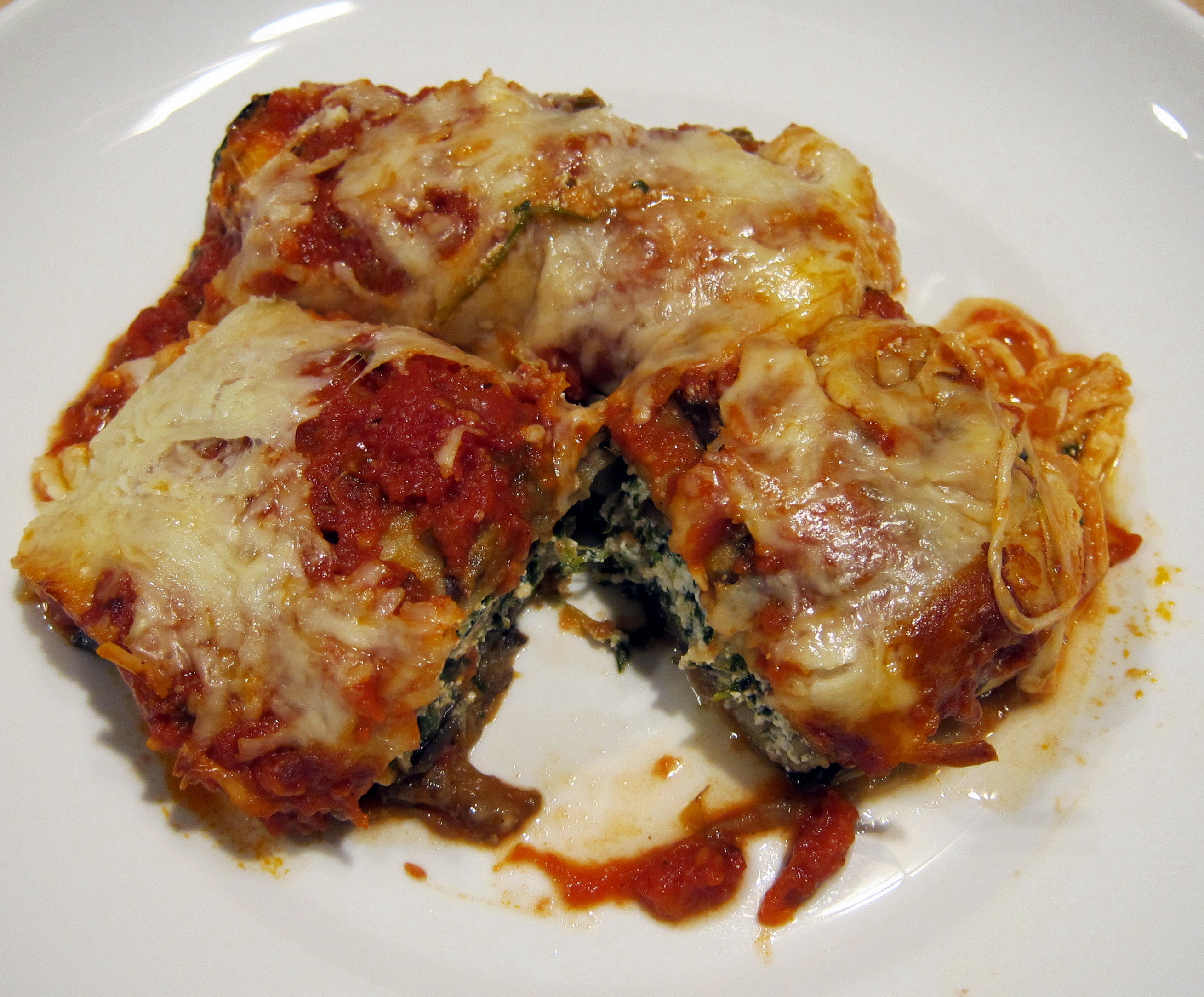 On your work surface lay out two slices of cooked eggplant slightly overlapping each other long ways. Spoon about 3 heaping tablespoons of the ricotta mixture onto the short end of the eggplant.