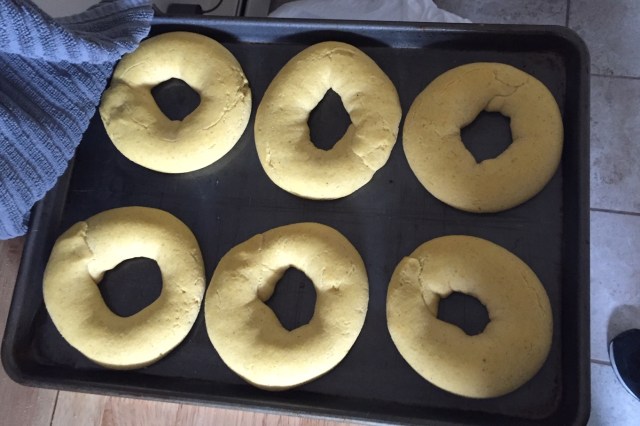 Now, cut small fist size pieces and roll into logs, then close them like a bagel. Add them to an oiled baking sheet. Cover with a cloth and let rise for 1 1/2 hours.