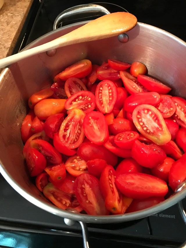 Cut the tomatoes in half and place in a stainless steel sauce pot. After adding half the tomatoes, place on medium heat and stir until you see liquid form at the bottom of the pot. Don’t allow the tomatoes to sit too long without stirring if there is no liquid on the bottom, they might burn.