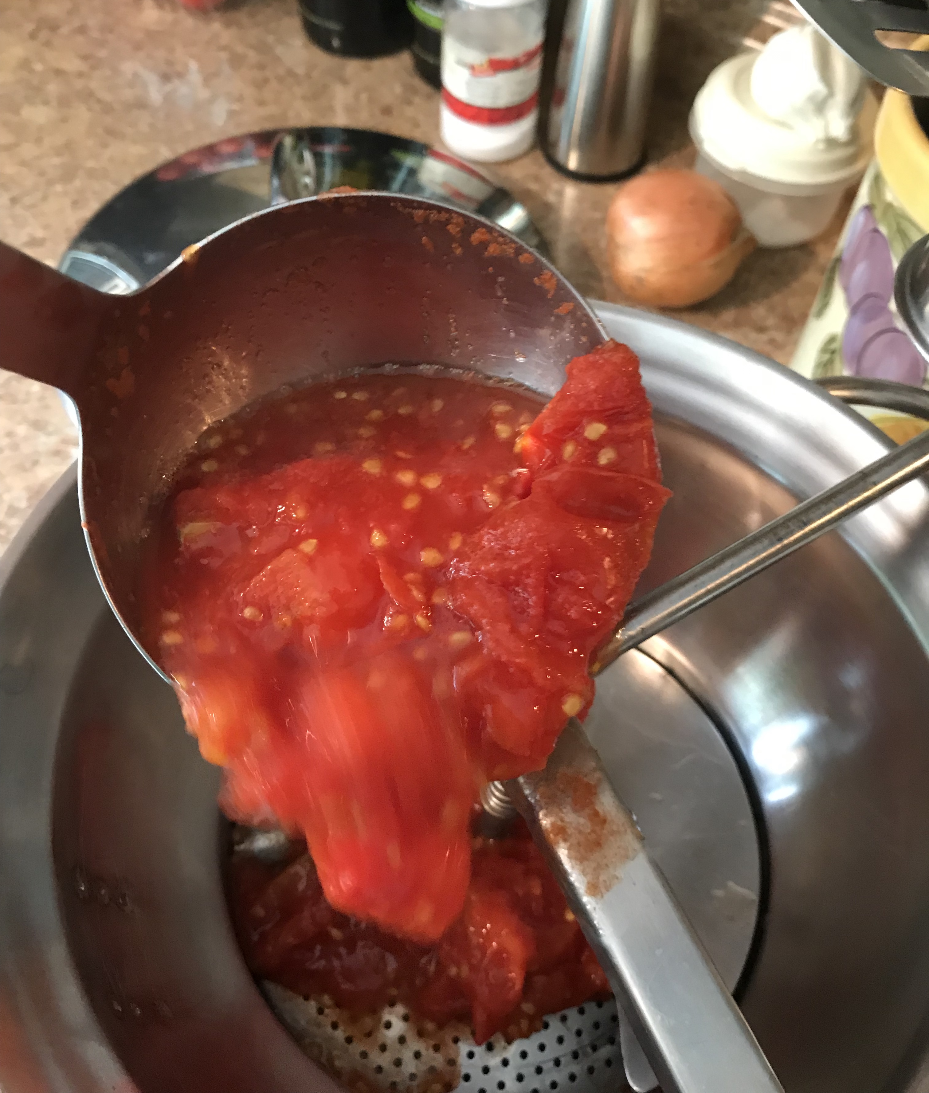 In between batches be sure to scrape the strained sauce from under the food mill into your bowl. Then discard the seeds and skins and add another batch. You should be able to process 5 pounds of tomatoes in two batches.