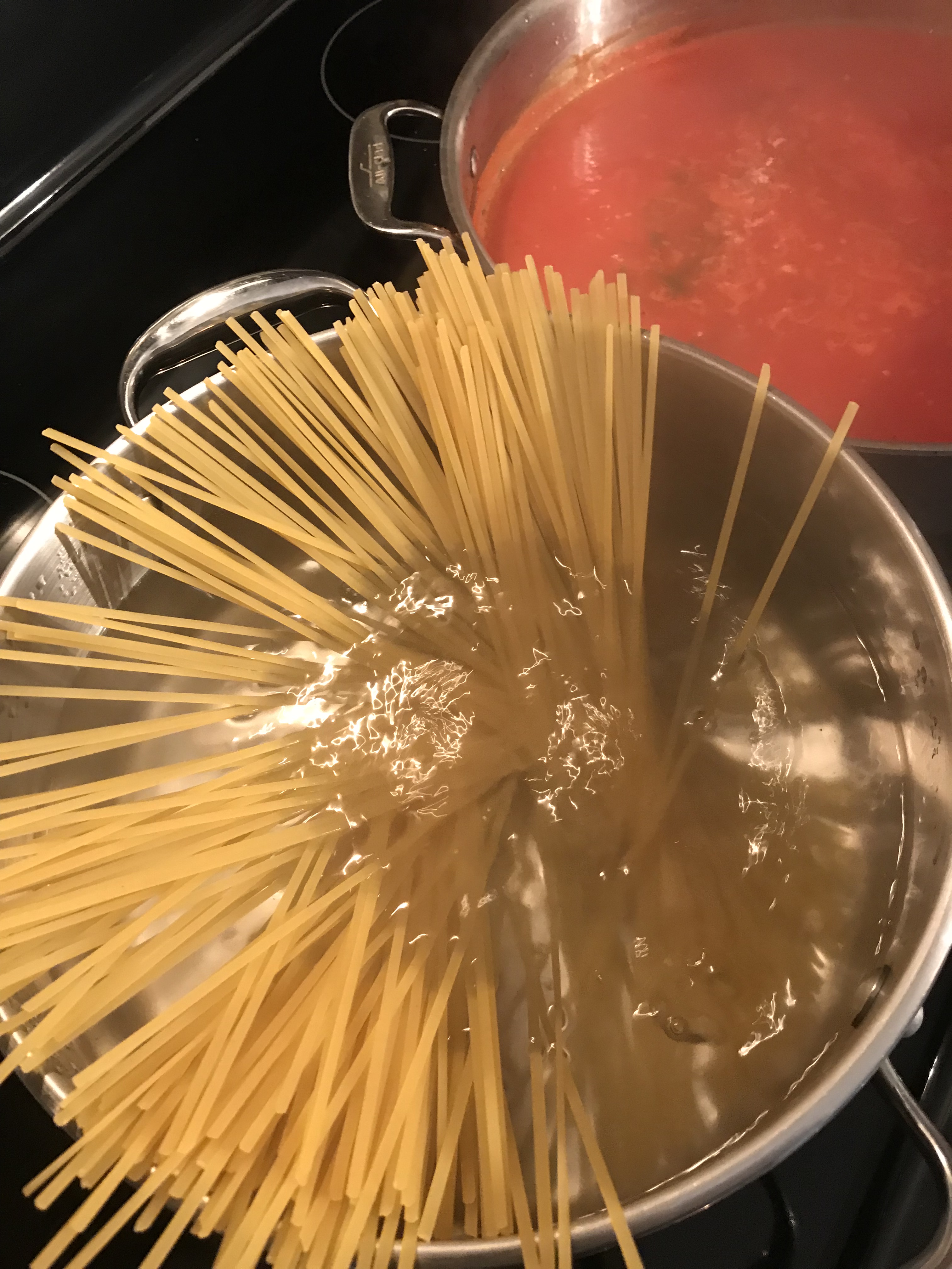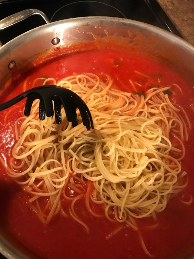 While the sauce is cooking you should have a large pot of salted water boiling. I like to use linguine, but use whatever macaroni you like. Add the macaroni to the boiling water just as the sauce is ready. I cook the macaroni about a minute less that the box calls for for al dente. The macaroni will continue to cook in the sauce.