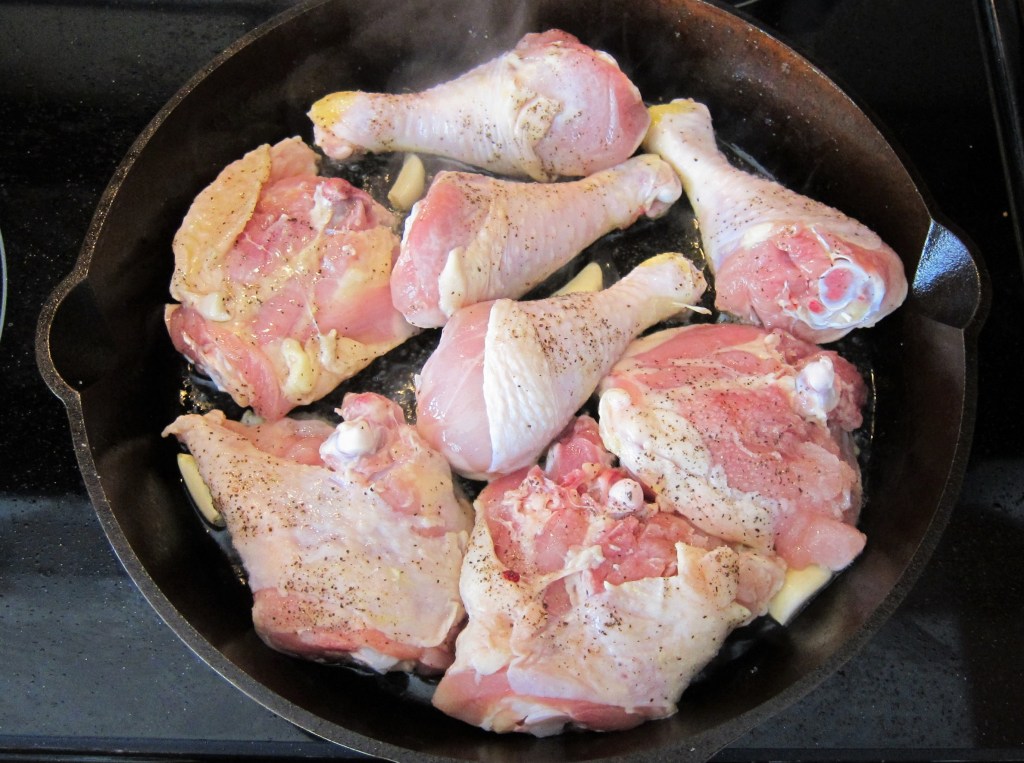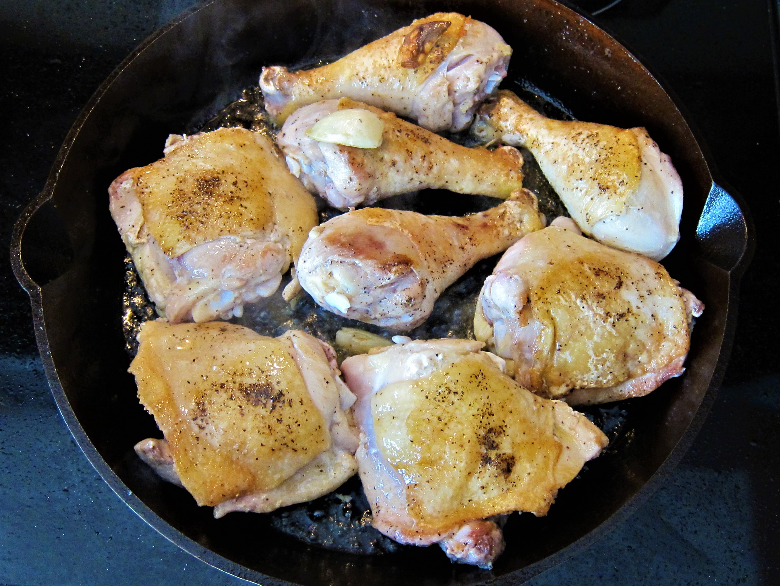 Salt and pepper your chicken on both sides. Place a large fry or sauté pan on medium high heat, large enough to hold all the chicken. Add the olive oil and garlic. When oil is hot add the chicken pieces skin side down.