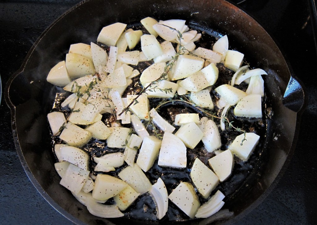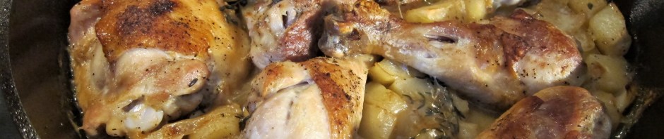 Add the potatoes and onions to the hot pan along with the thyme. Salt and pepper the potatoes. Cook till onions become translucent, about 4-5 minutes. Lower the heat and deglaze the pan with the white wine. Cook down about 1 minute. Push the potatoes and onions off to the side and add the chicken along with the garlic back to the pan, skin side up. Mix the potatoes all around the chicken.