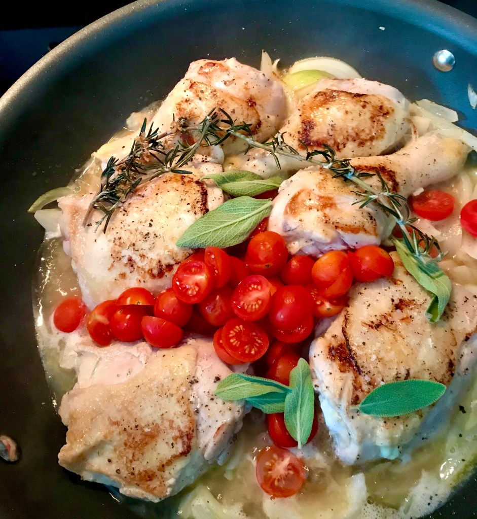 There are many recipes for chicken cacciatore out there. This one utilizes the ever popular cherry tomato, which lately have become the tomato of choice for all the modern chefs. Traditional cacciatore uses white wine, plum tomatoes, onions, garlic. I flavor this cacciatore with sage and rosemary which lends an earthy flavor to the chicken. The cherry tomatoes add a unique sweetness and blush to the sauce. And like many delicious Italian recipes, less is better. Using simple fresh quality ingredients is the hallmark of many delicious Italian meals. This one is right up there. I hope you try it.