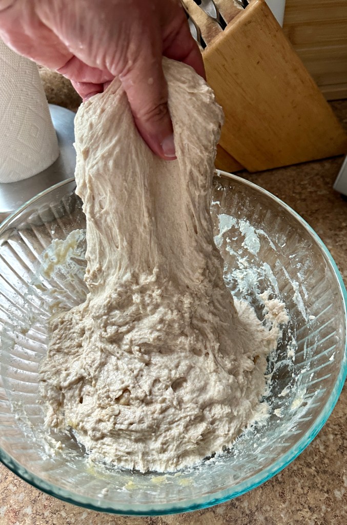 Take the bowl out and with wet hands gently pick up the dough and fold it over on itself several times, turning the bowl a quarter turn to get all four sides. Cover the bowl again, and let it rise for another hour.