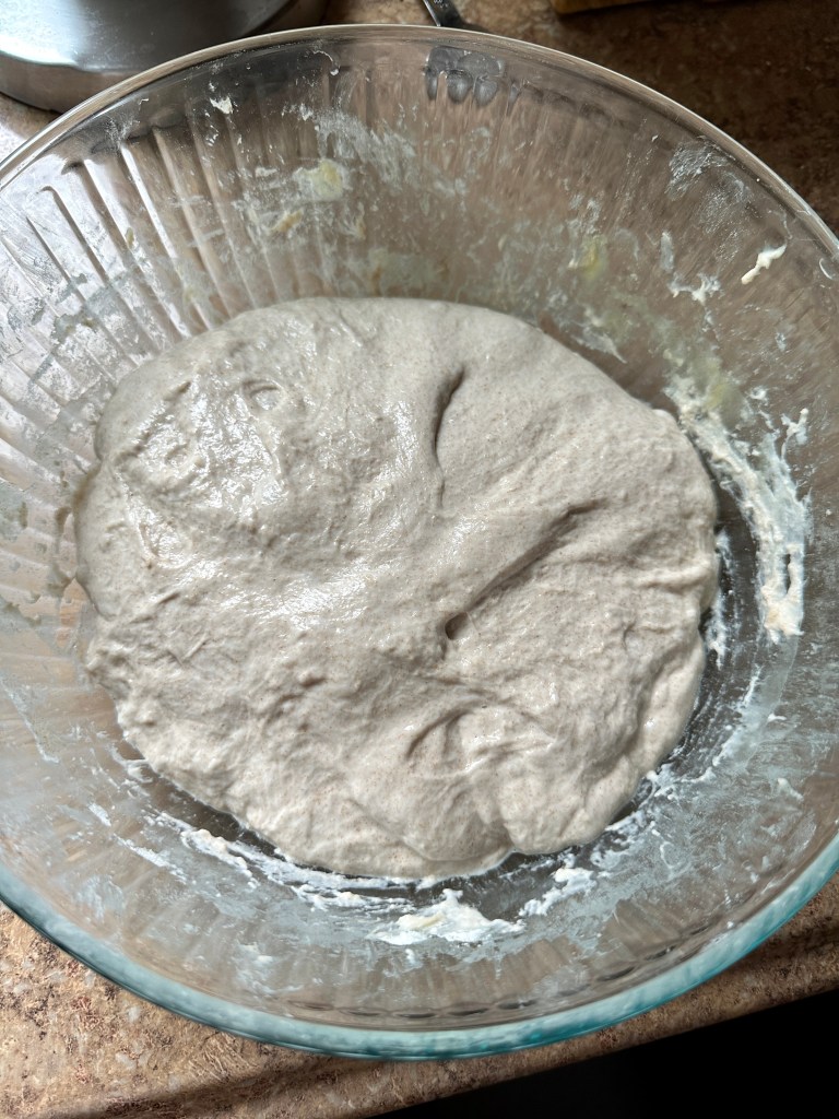 After 18 hours in the refrigerator the dough is relaxed and expanded.