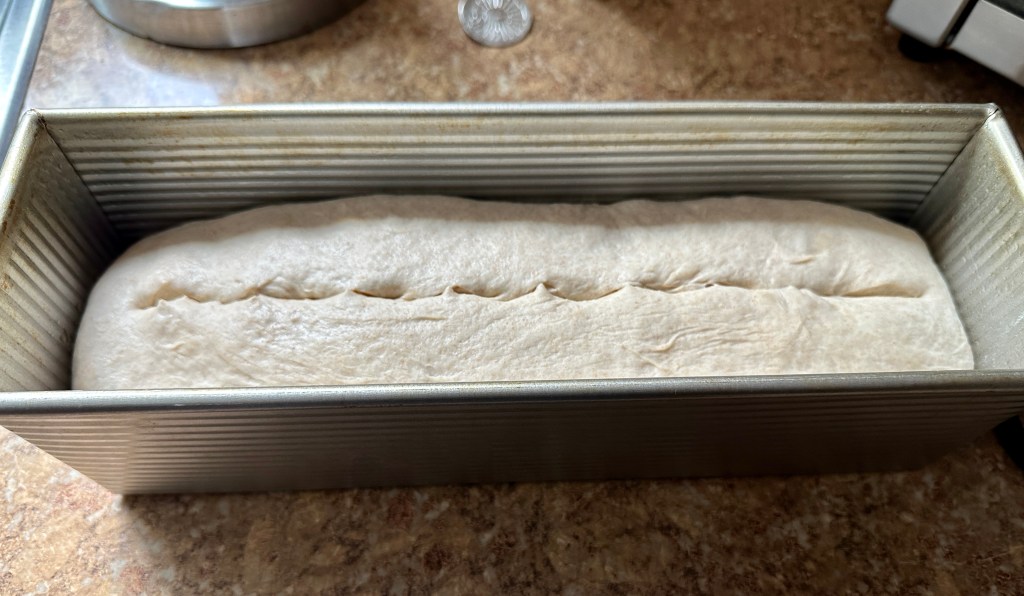 Next, shape the dough to fit the vessel in which you’ll bake it. I use a 13″ x 4″ pullman loaf pan made by USA Pan Bakeware. It gives me the perfect size for sliced bread. You can also use a large round boule or Dutch oven for a round rustic loaf. Place the shaped dough into the lightly greased base of the baker and cover it with a towel or lid. Let the loaf warm to room temperature and rise, this should take 3 hours. It won’t appear to rise upwards that much, but will relax and expand. Again, I place it in my oven with the oven light on to keep it at the perfect proofing temperature.