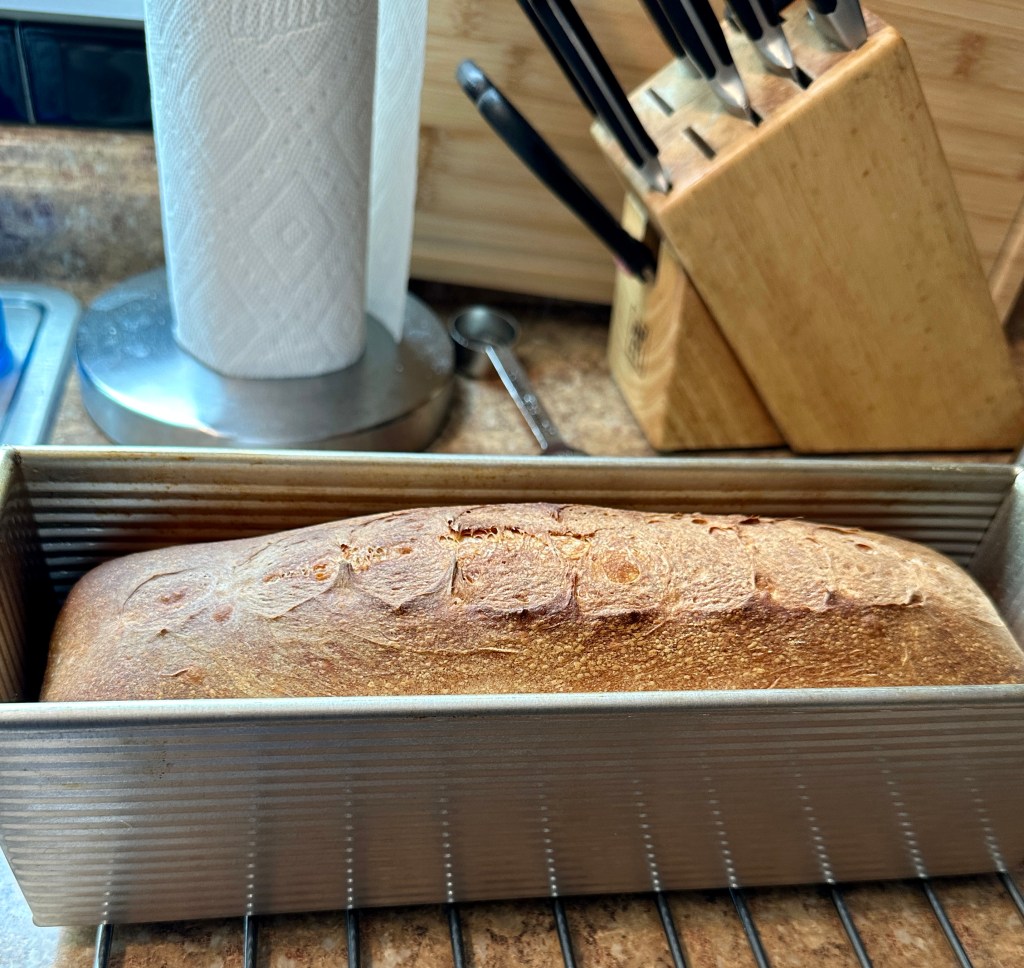 Remove the bread from the oven and transfer it from the pan to a rack to cool completely, about 3 hours.