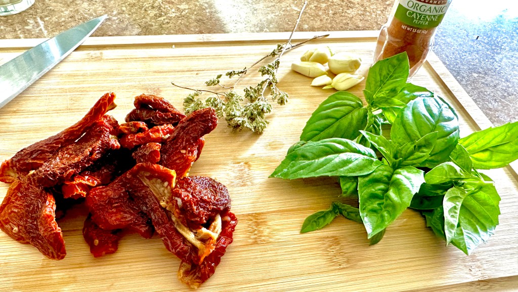 Pictured are the sun-dried tomatoes, Sicilian oregano, garlic, cayenne pepper and fresh basil.