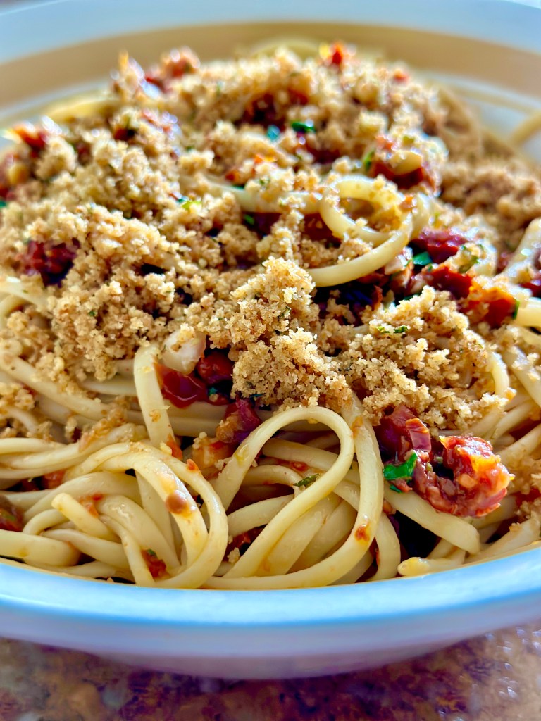 This is not the classic pesto recipe with adding sun-dried tomatoes. There are no nut meats here or grated Pecorino Romano cheese. This is an uncooked pasta dressing that comes from Sicilian peasantry. The addition of toasted breadcrumbs is the alternative to grated cheese when cheese was not readily available. Of course like all peasant cooking, the ingredients became a staple for certain dishes even when the more expensive ones were available.
