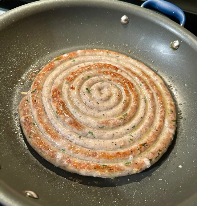 Use a large 14″ skillet to prepare this recipe. It has to be large enough to hold all the ingredients. First brown the sausage on medium high heat about 4 minutes on each side. Remove the sausage to a plate and put aside till later.