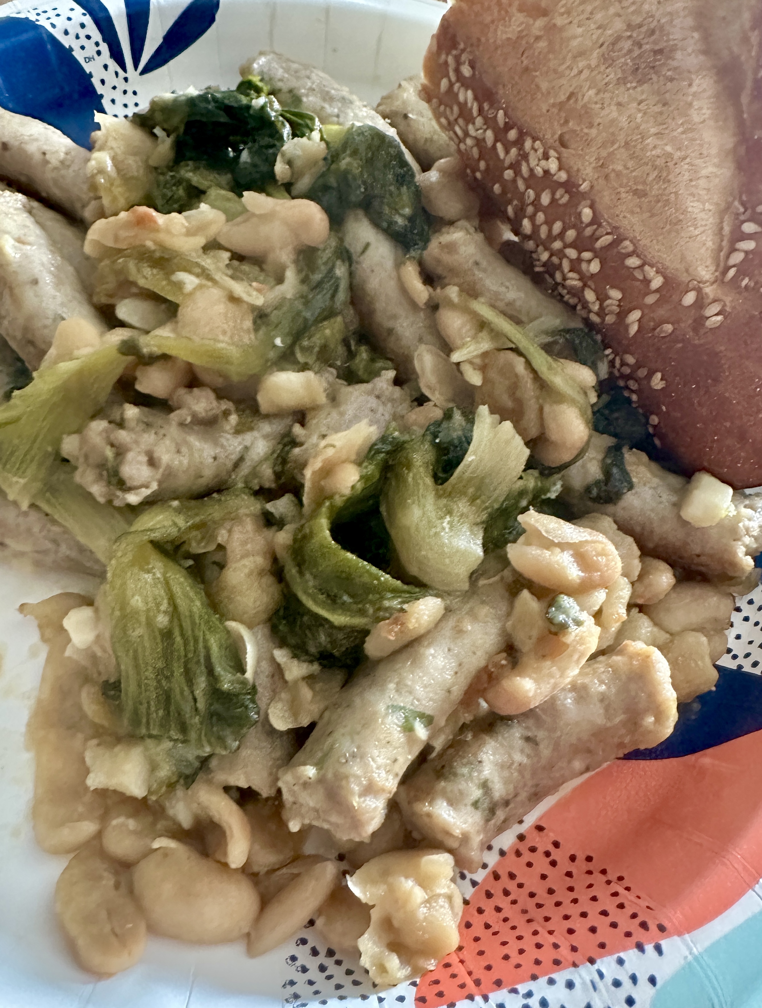 When my grandmother prepared scarola, she would saute some garlic in olive oil in a large pot. Then she would add the scarola with some water and salt. She cooked it till it was tender. We would enjoy her scarola in a bowl with plenty of the liquid. We added extra olive oil and dipped our bread in it. She made it every time for me when I was sick. It became one of my comfort foods. Other members of my family would make scarola and add sausage and beans to the dish. They would remove all of the liquid. Then, they would saute the scarola on medium high heat until the beans broke up. The beans would get incorporated into the scarola. Adding some grilled sausage made this a delicious one pan meal.