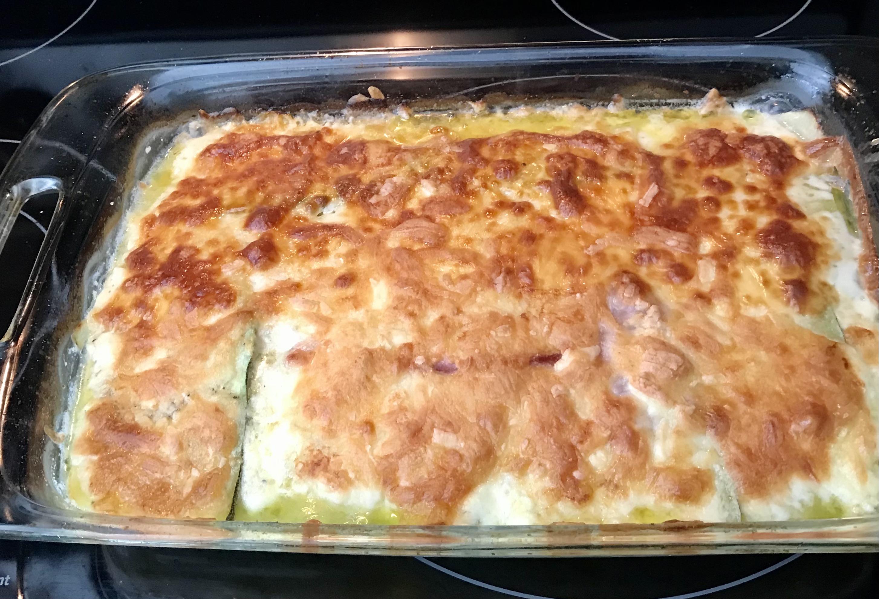 For the second layer add a sprinkle of the olive oil. Then add the egg dipped zucchini, salt & pepper, cooked ham and a layer of the sliced provolone. Add a good sprinkle of the Parmigiano Reggiano Cheese.