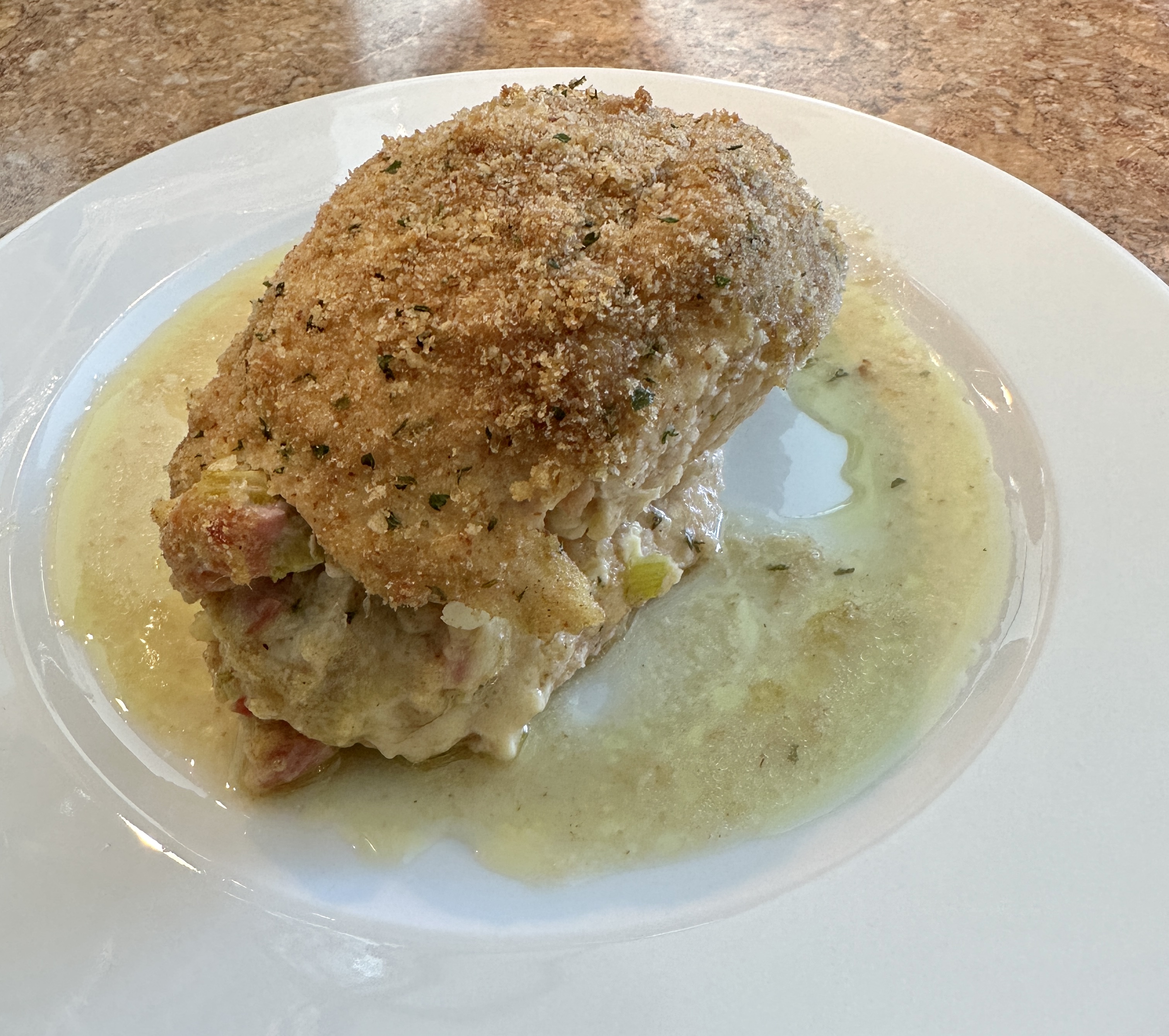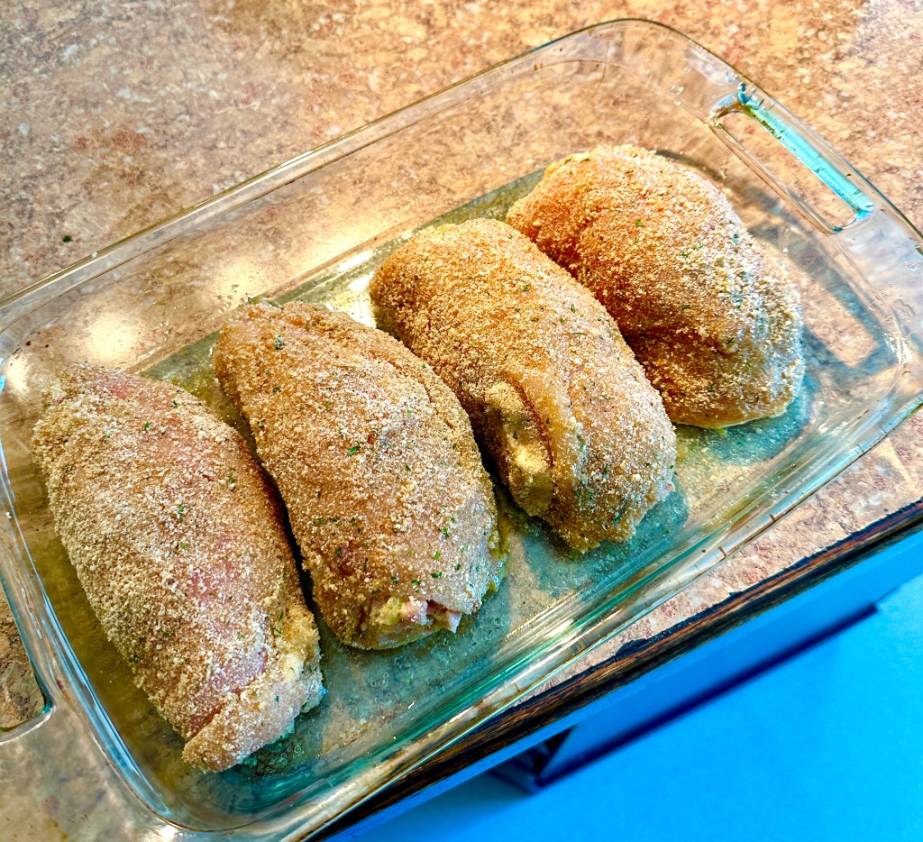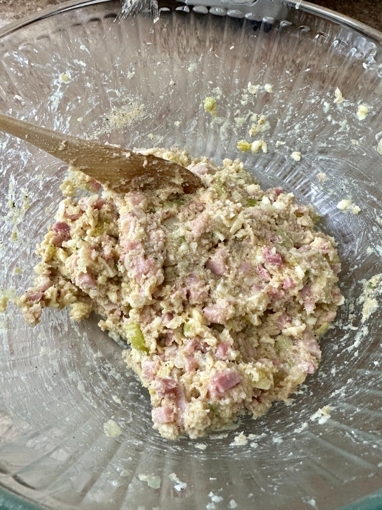 I had some boneless chicken breast and had plenty of ham left over from Easter so I had all of the main ingredients for this dish. I used my homemade sourdough bread for the stuffing but you can use any day old bread without the crust for this recipe. Use what you have. That seems to be the mantra for 2023.
