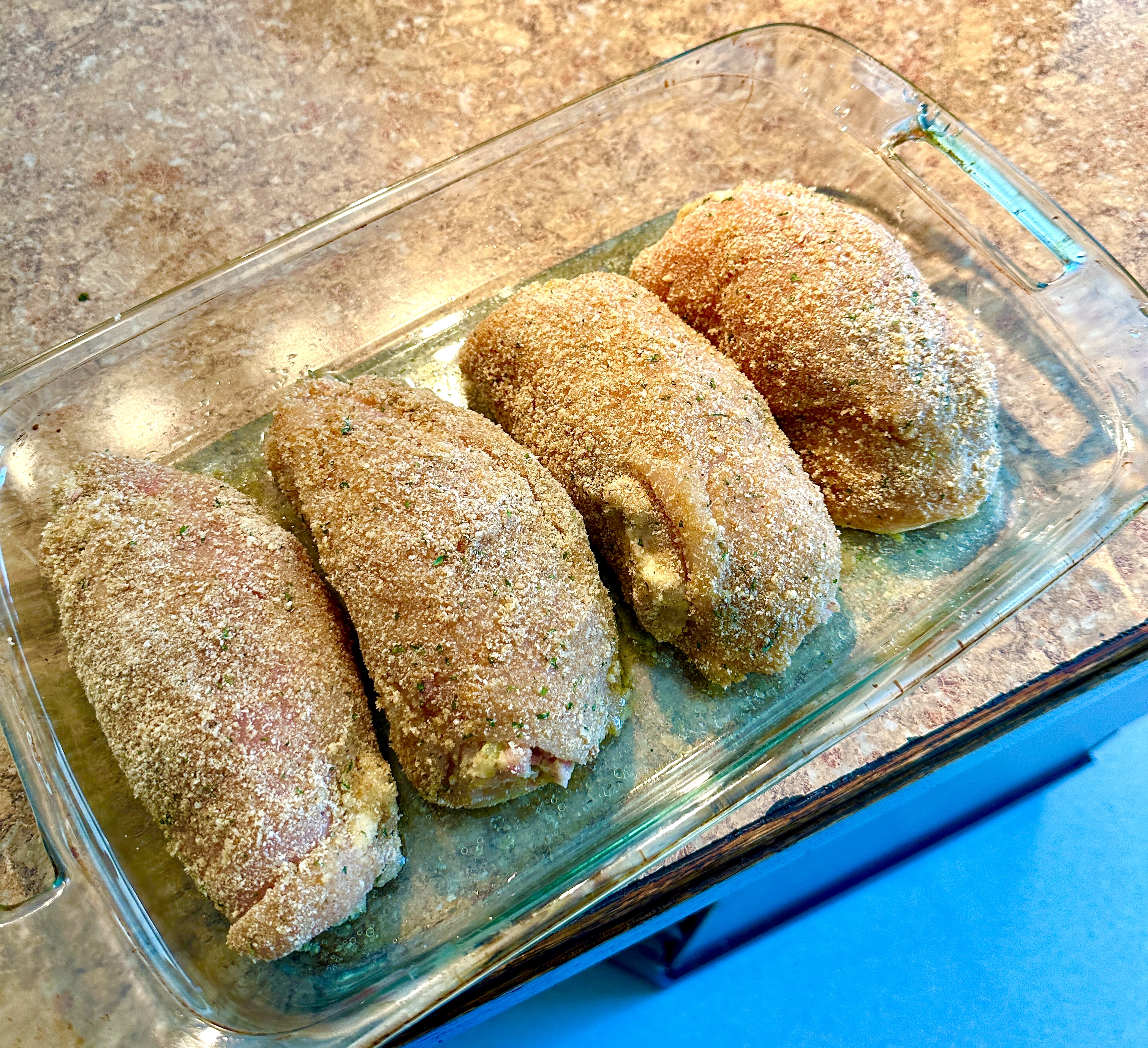 Take each piece of chicken and coat one side in the olive oil. Now place the coated side in the breadcrumb, taping down to adhere the coating. Take 1/4 of the stuffing and place it in the middle of the breast. Starting on the short end, roll up the chicken over the stuffing and make sure it is well coated with the breadcrumbs, patting and turning in the crumbs. You can seal the rollatini with toothpicks but I just place the finished rollatini seam side down in the roasting pan and that usually is fine without them opening up.