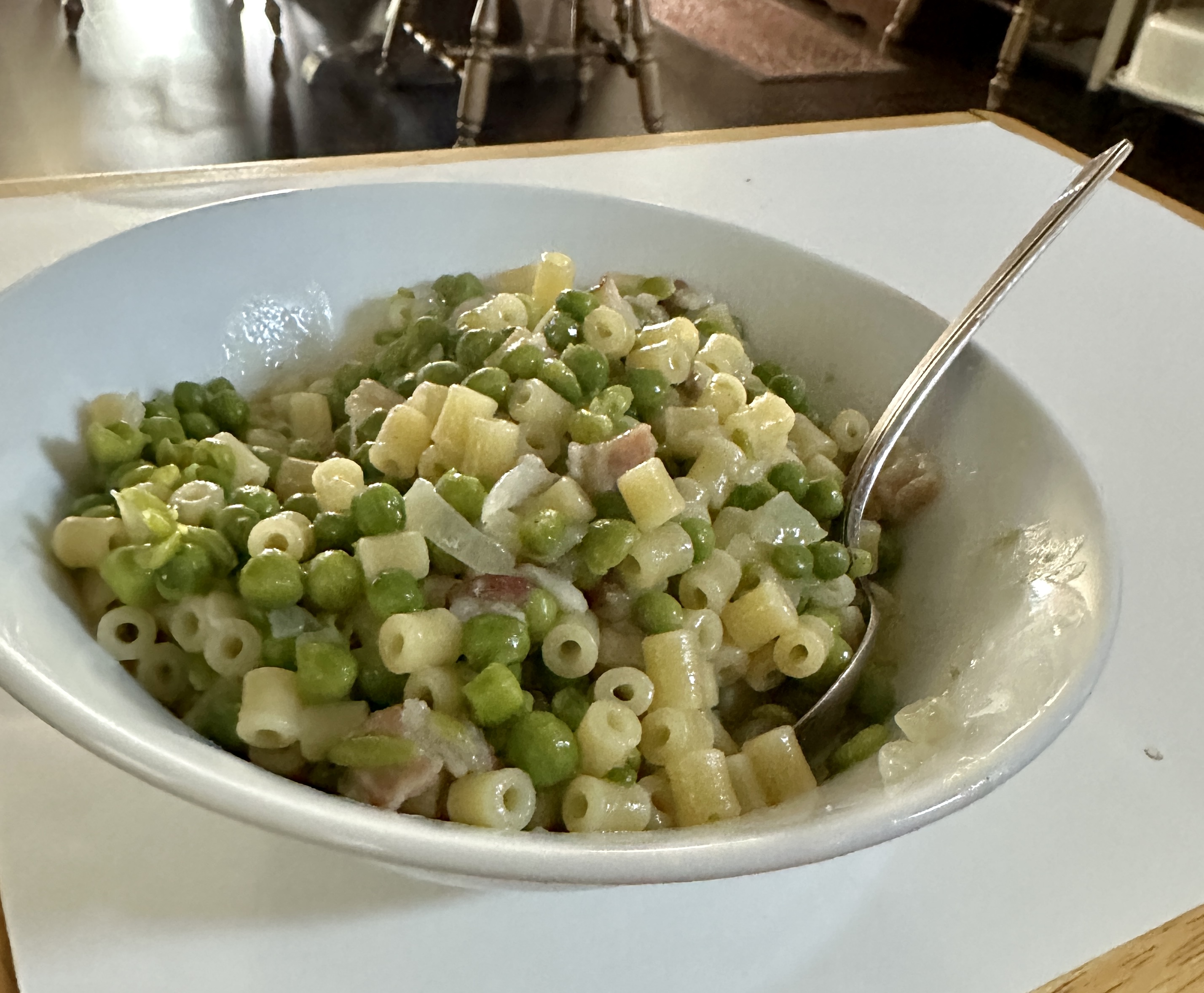 This is a very satisfying meal. I’ve seen it made many ways. Some add tomato sauce, some prepare it like a soup. I love the combination of smokey American bacon and peas, if you use pancetta it changes the whole flavor profile. I also like a creamy consistency which is obtained by cooking the macaroni in the water you serve it with. Adding the grated cheese also adds to the creaminess. Strike the balance by only adding more water if you need to. Another technique I use is when I cook the peas, before adding the water and macaroni, I mash the peas up a bit with the back of my spoon. This also adds to the creaminess. You can use any small pasta you prefer, small shells, elbows, but my favorite is Ditalini. Overall, it’s a sweet savory dish that’s sure to please. Give it a try.