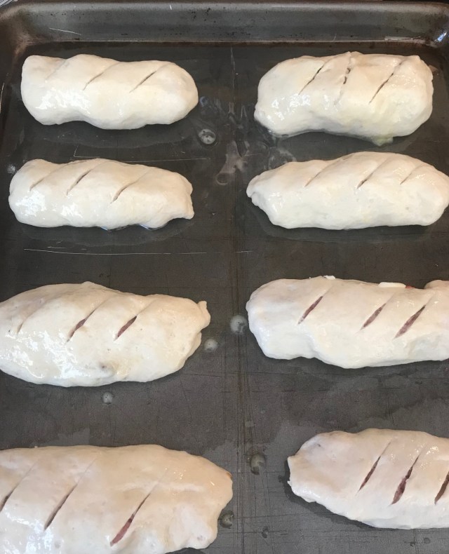 Now, cut small fist size pieces and roll into logs, then close them like a bagel. Add them to an oiled baking sheet. Cover with a cloth and let rise for 1 1/2 hours.